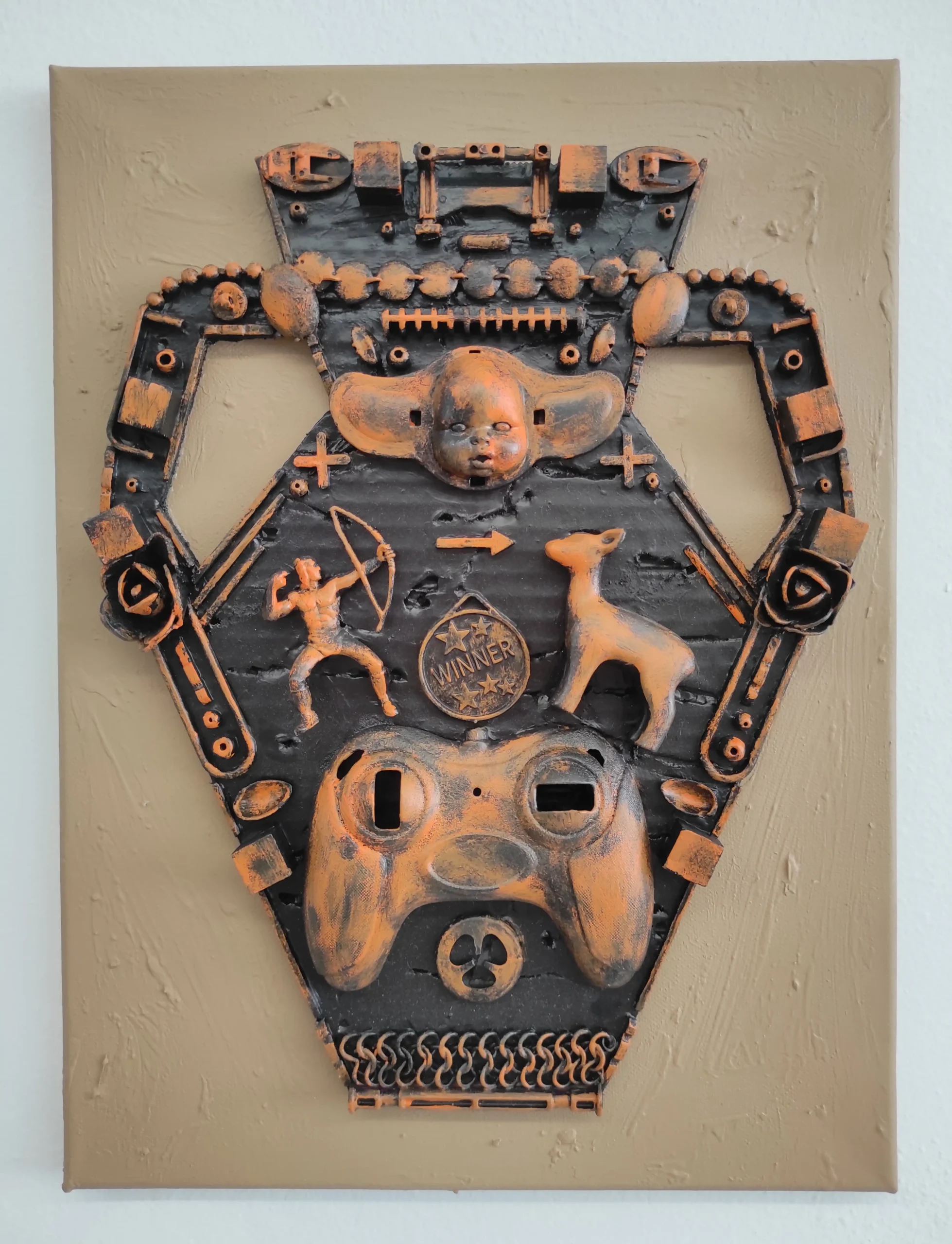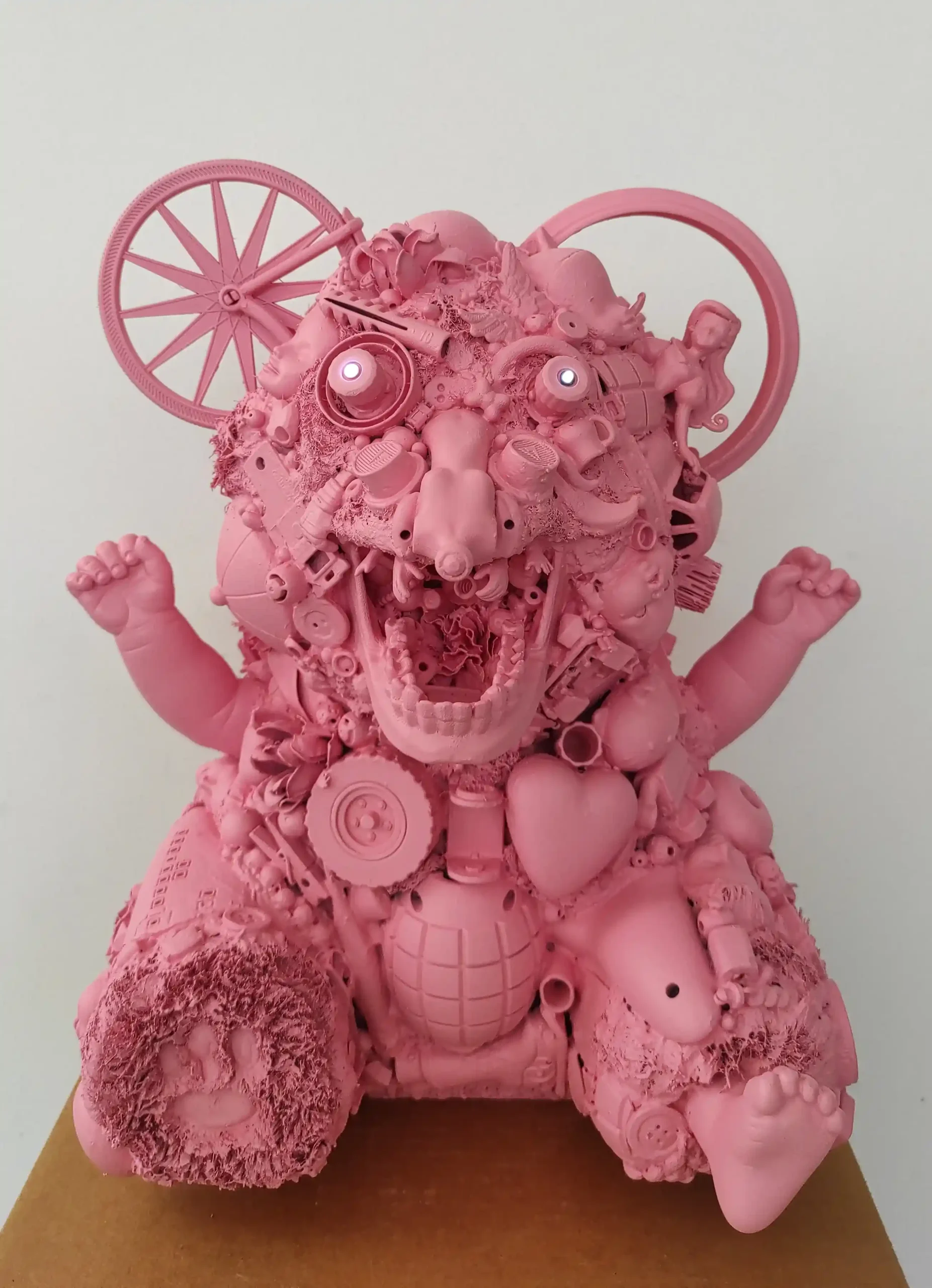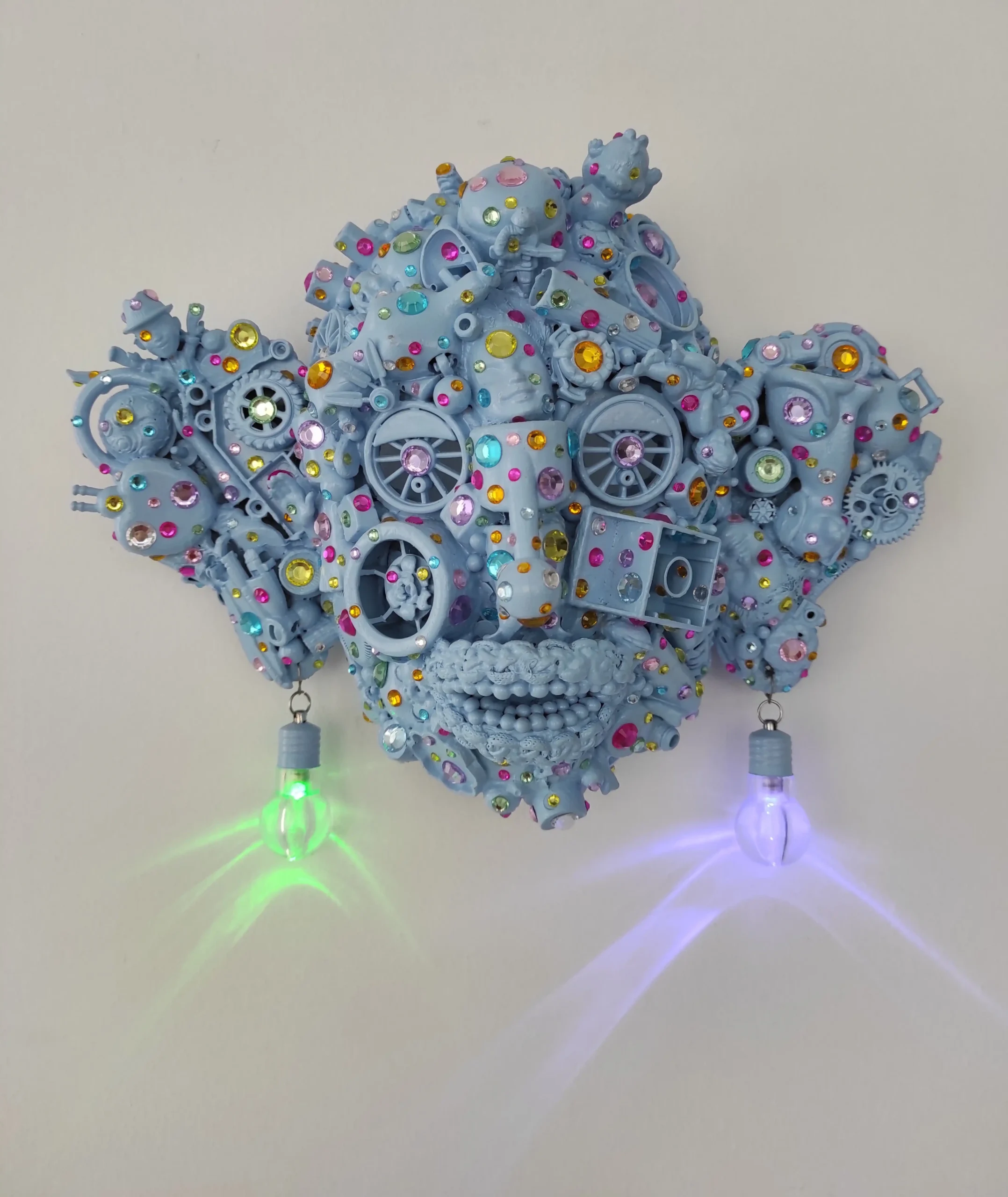 Fotios Balas’ intricate headpieces and masks, comprised of both high and lowbrow elements sit on the boundary between fine art and haute couture. Although he follows the global de rigeur of repurposing/upcycling, he declares that fashion for him has an essence of flirtation and his relationship is purely speculative. The Athens based artist mixes together used toys, fabrics, scraps, and random materials he collects to compose works that expose minimal elements of the wearer’s face. He looks for « beauty » in the most uncertain places and he is attracted to things that have withstood the wear and tear of time and fulfilled the purpose for which they were created, altering the perception of utility, its lifespan, or its status. Utilizing LED lights, motors, movement mechanisms, and even household appliances, the pieces are intended to operate as both art objects and wearable sculptures which test the human limits.