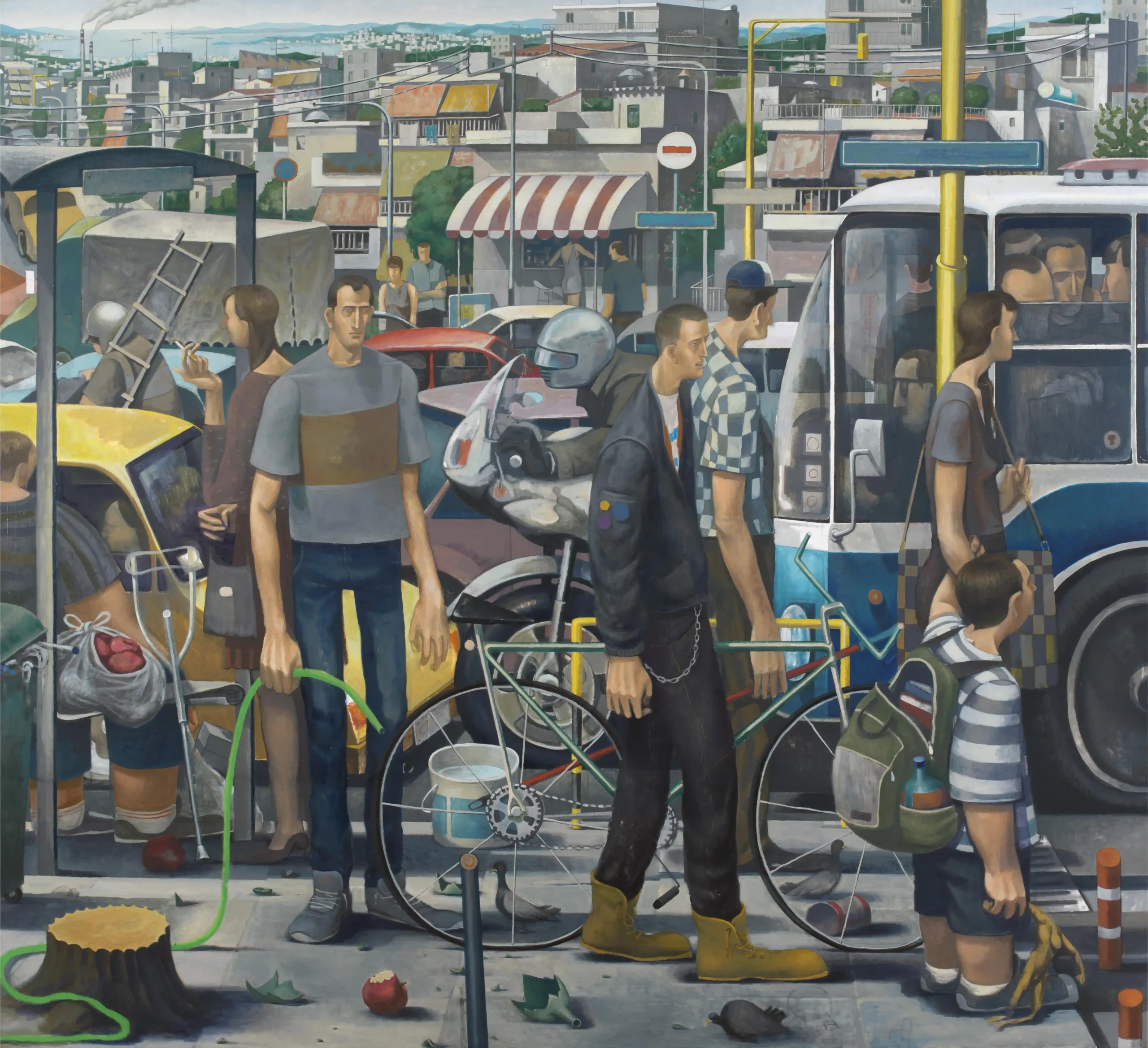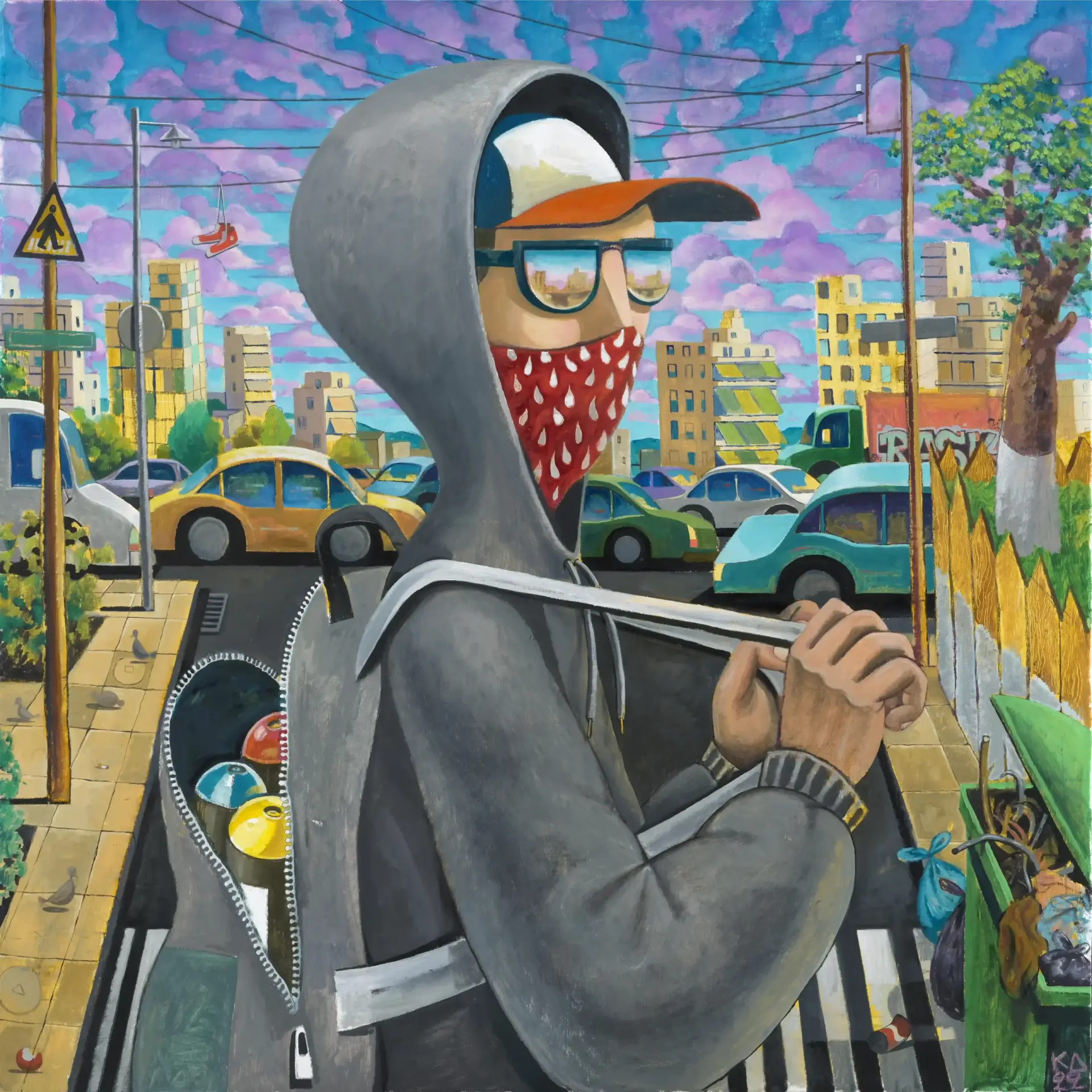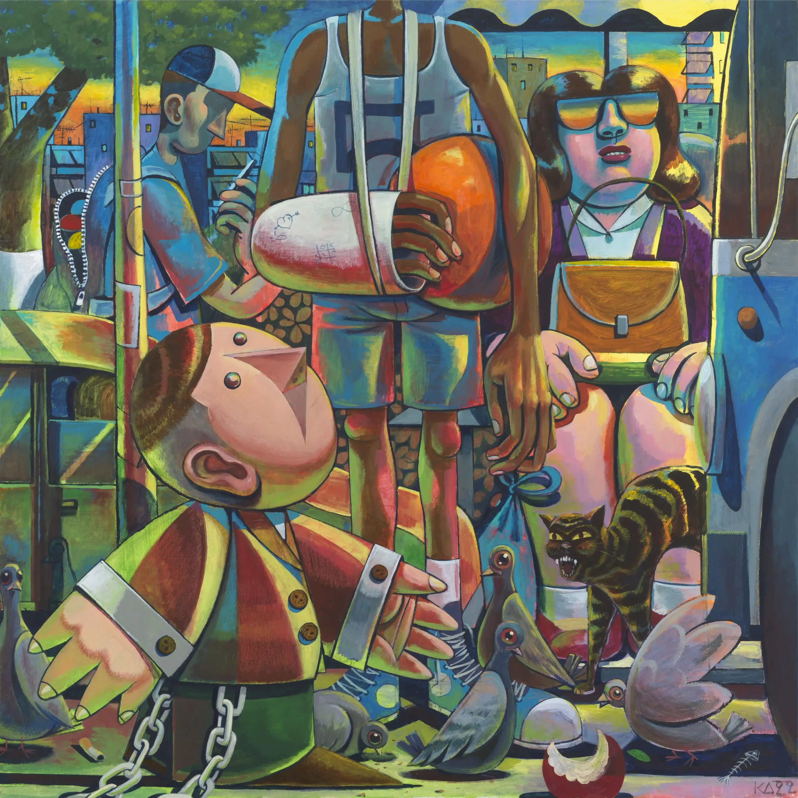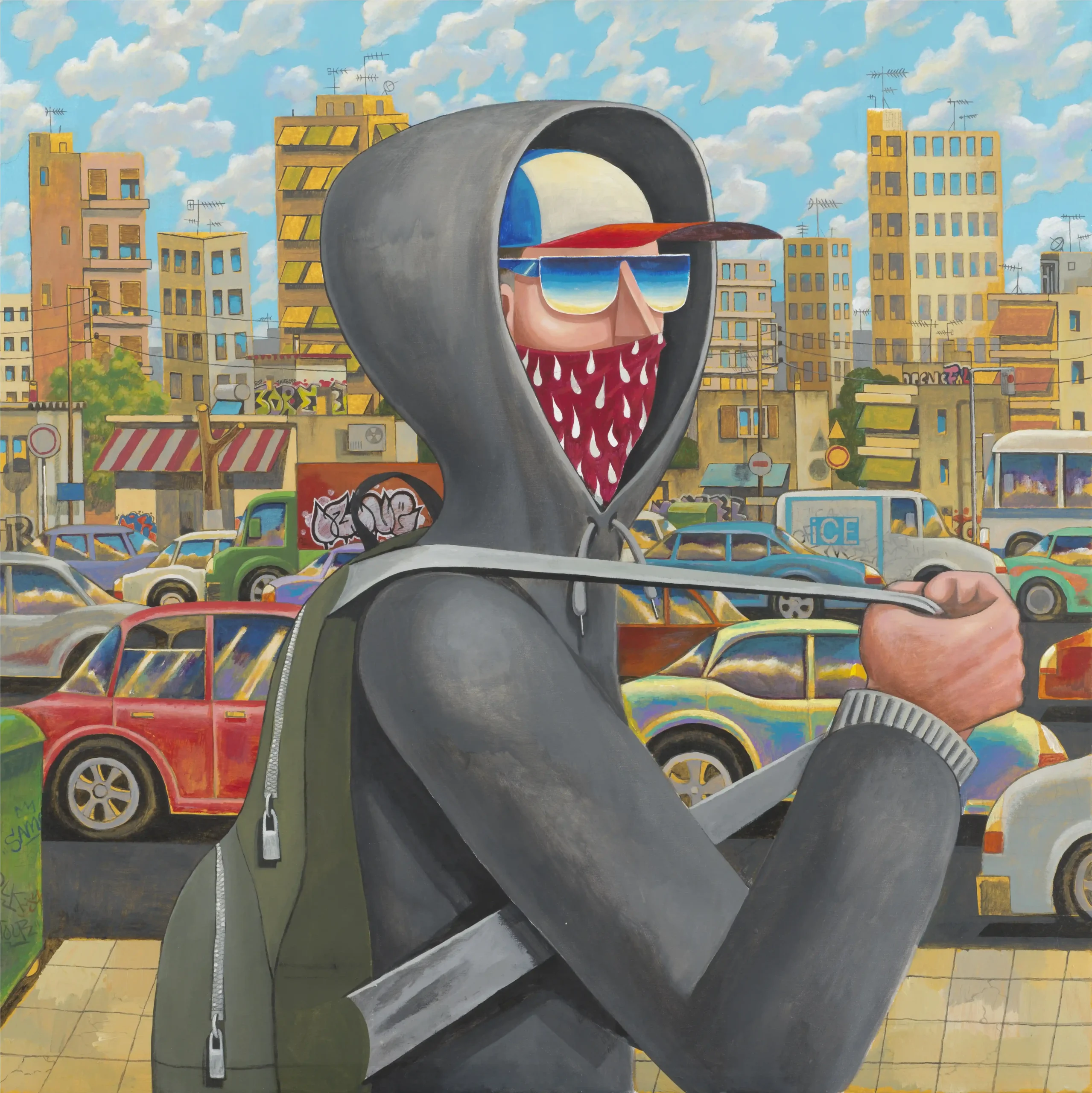 Kostis Damoulakis, lives and practices his art in Athens since graduating from the Faculty of Fine and Applied Arts of the Aristotle University of Thessaloniki in 2015. The visual language and subject matter of his works have been influenced by his early exposure in graffiti and tattoo art. His contemporary paintings, distinguished for their anthropocentric approach, examine urban city life and shed light to the invisible beauty of the daily mundane while incorporating symbols from different art movements, civilizations and chronological eras.