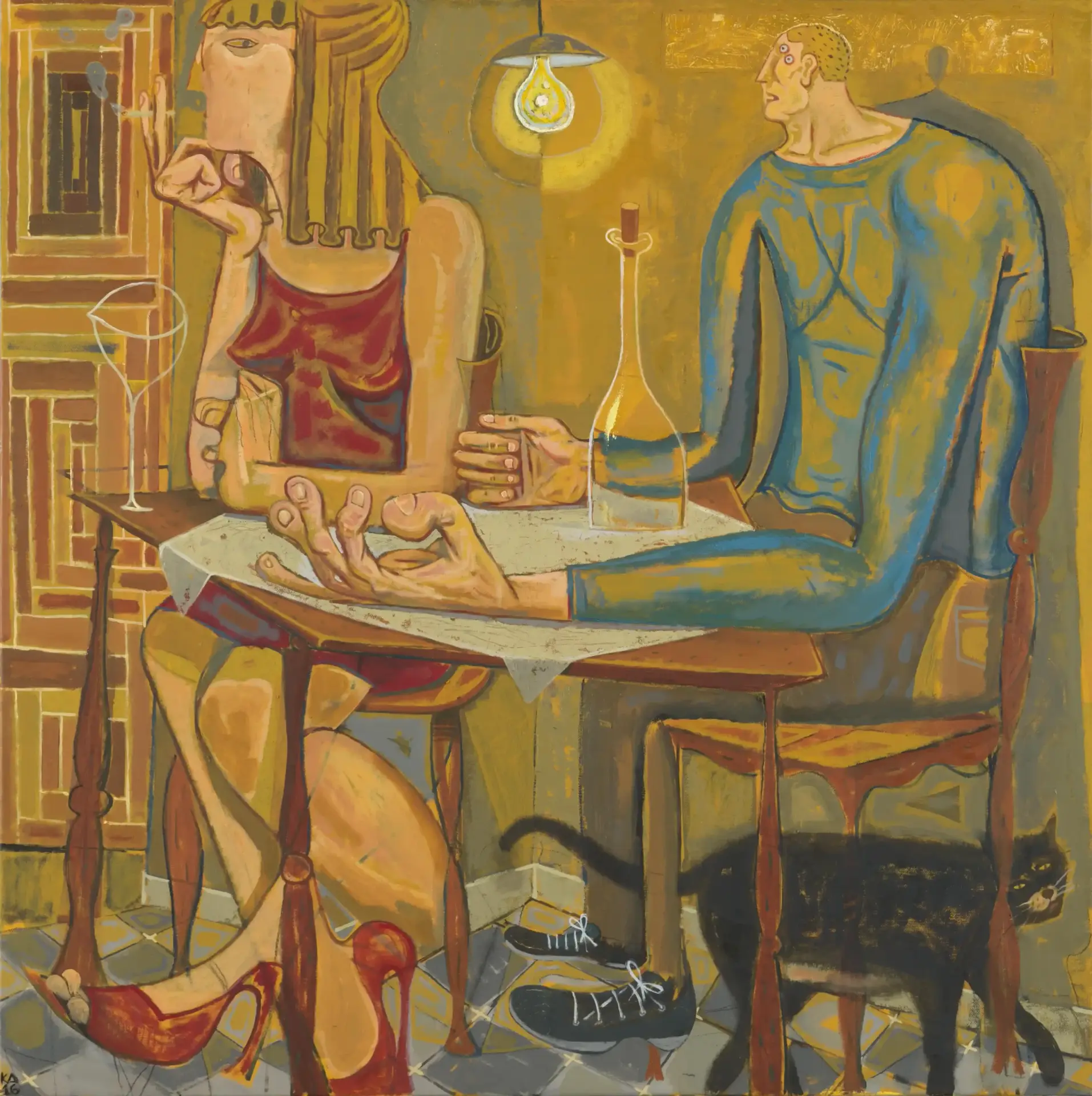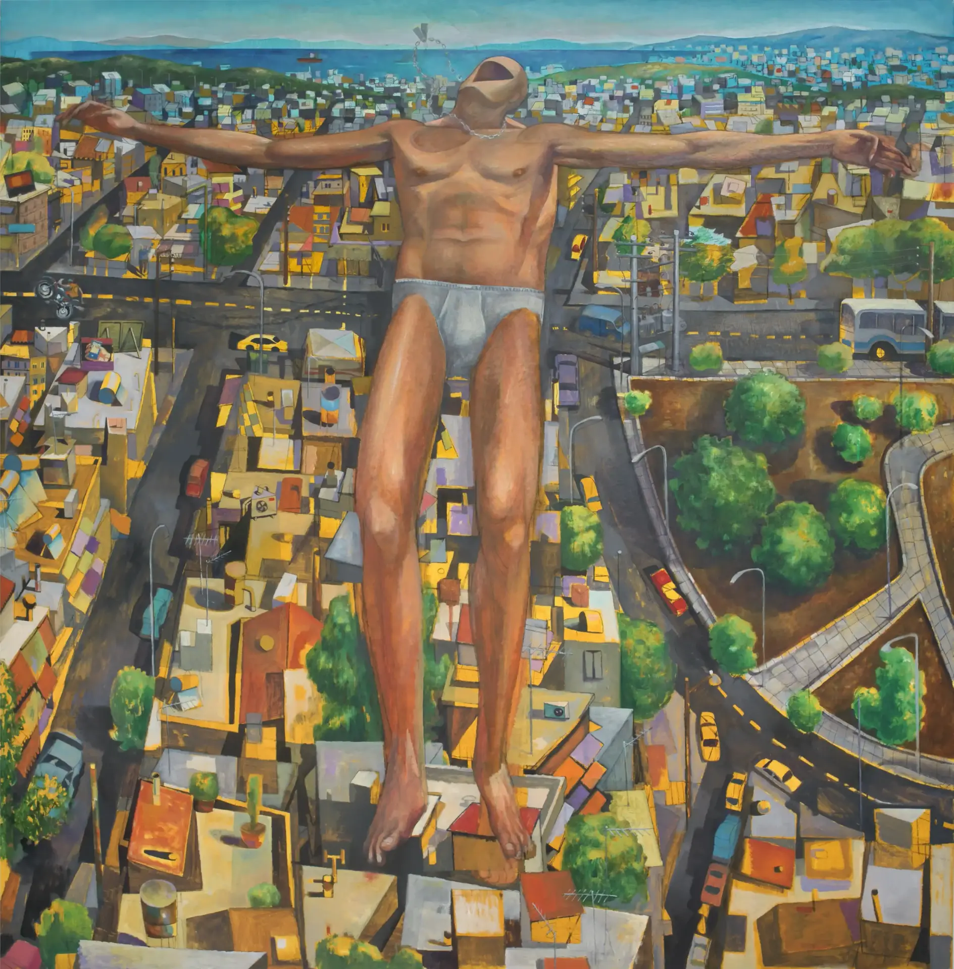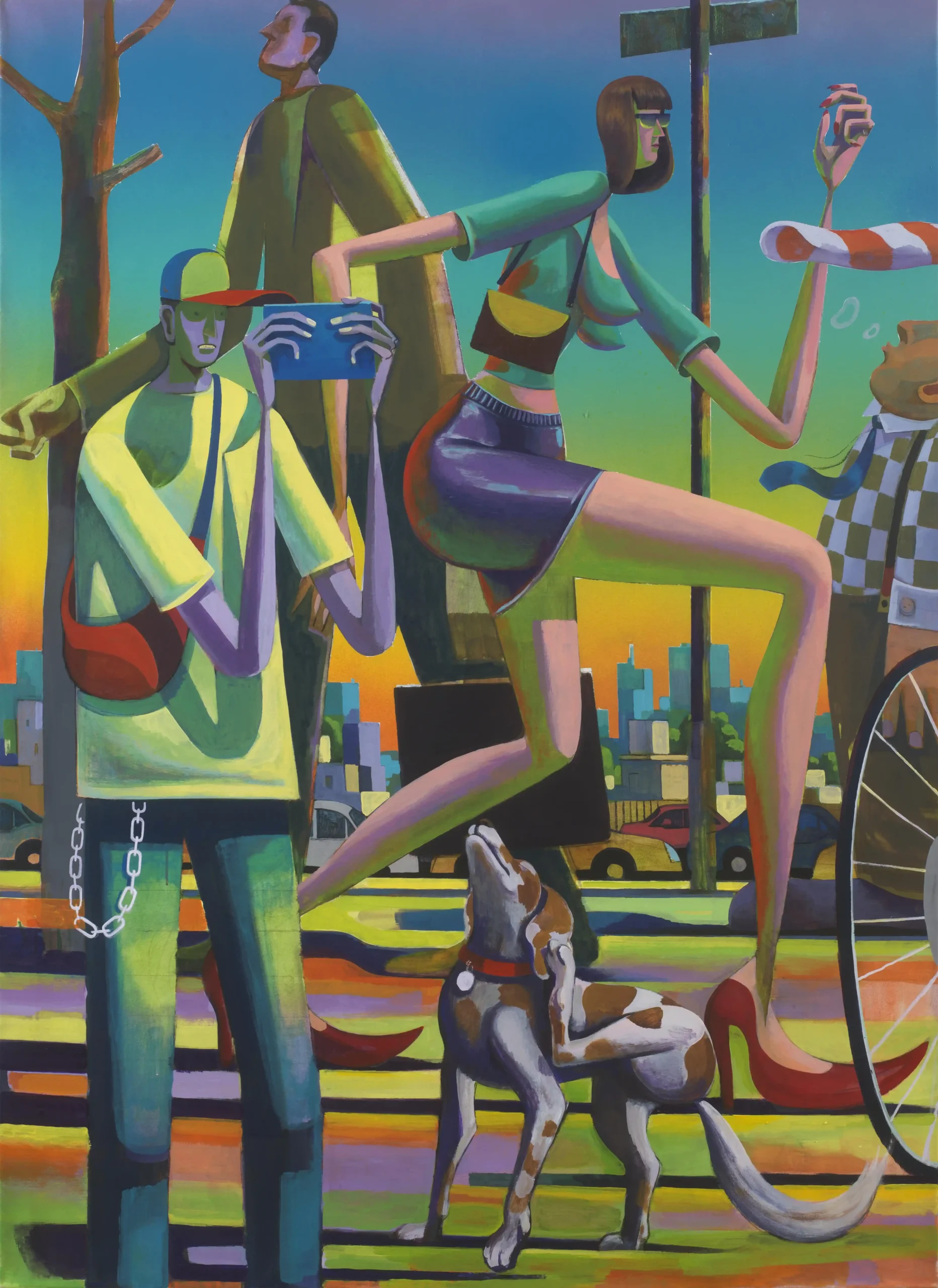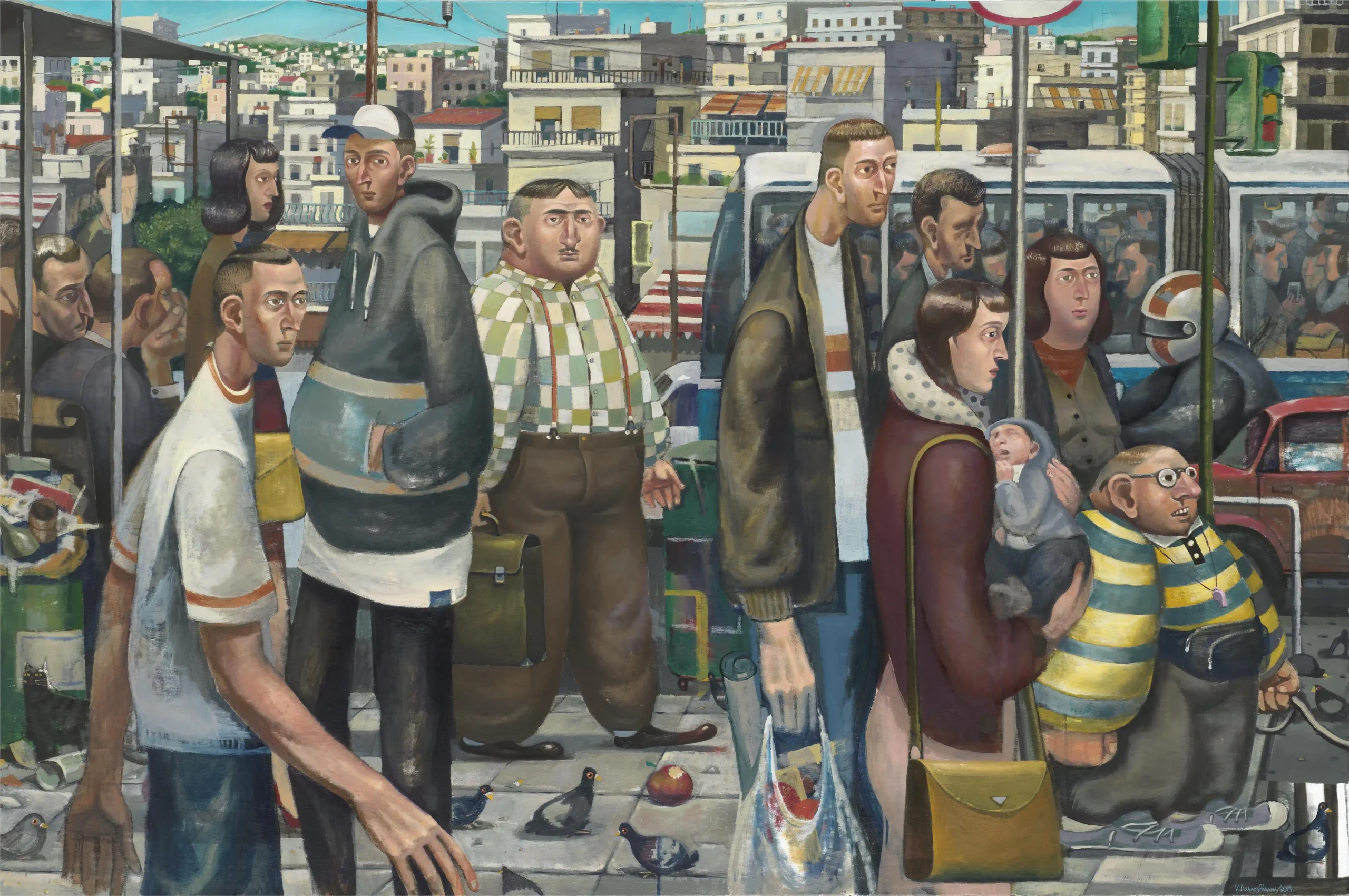 Kostis Damoulakis, lives and practices his art in Athens since graduating from the Faculty of Fine and Applied Arts of the Aristotle University of Thessaloniki in 2015. The visual language and subject matter of his works have been influenced by his early exposure in graffiti and tattoo art. His contemporary paintings, distinguished for their anthropocentric approach, examine urban city life and shed light to the invisible beauty of the daily mundane while incorporating symbols from different art movements, civilizations and chronological eras.